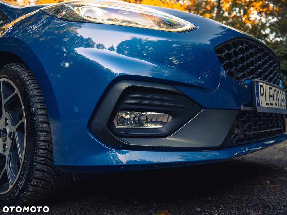 Sportowe akcenty: czarne obudowy halogenów, czerwony emblemat ST, sportowe zawieszenie Ford Performance.