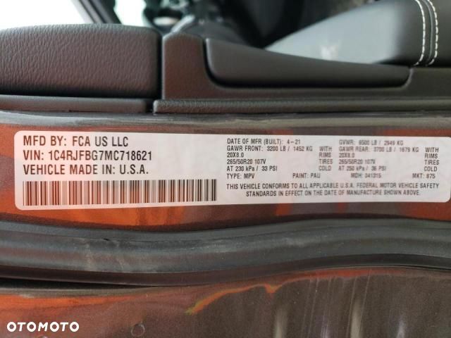 Firma KOMEL oferuje samochód Jeep Grand Cherokee Limited 2021r. 3,6 L 4X4 (poj 6,4l w opisie to błąd otomoto) Samochód sprawny technicznie, jeżdżący, odpalający, aktualny przebieg (w milach) uszkodzenia jak na zdjęciach. Auto z ubezpieczalni pojazdów uszkodzonych.